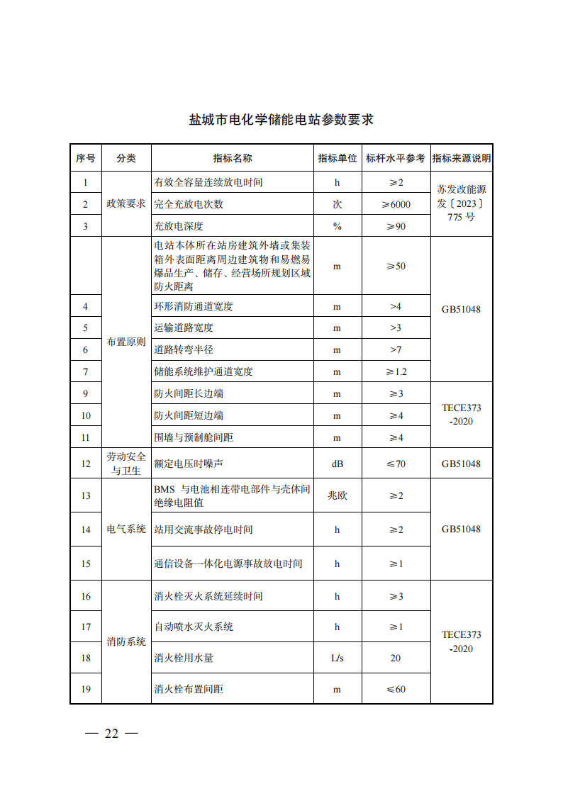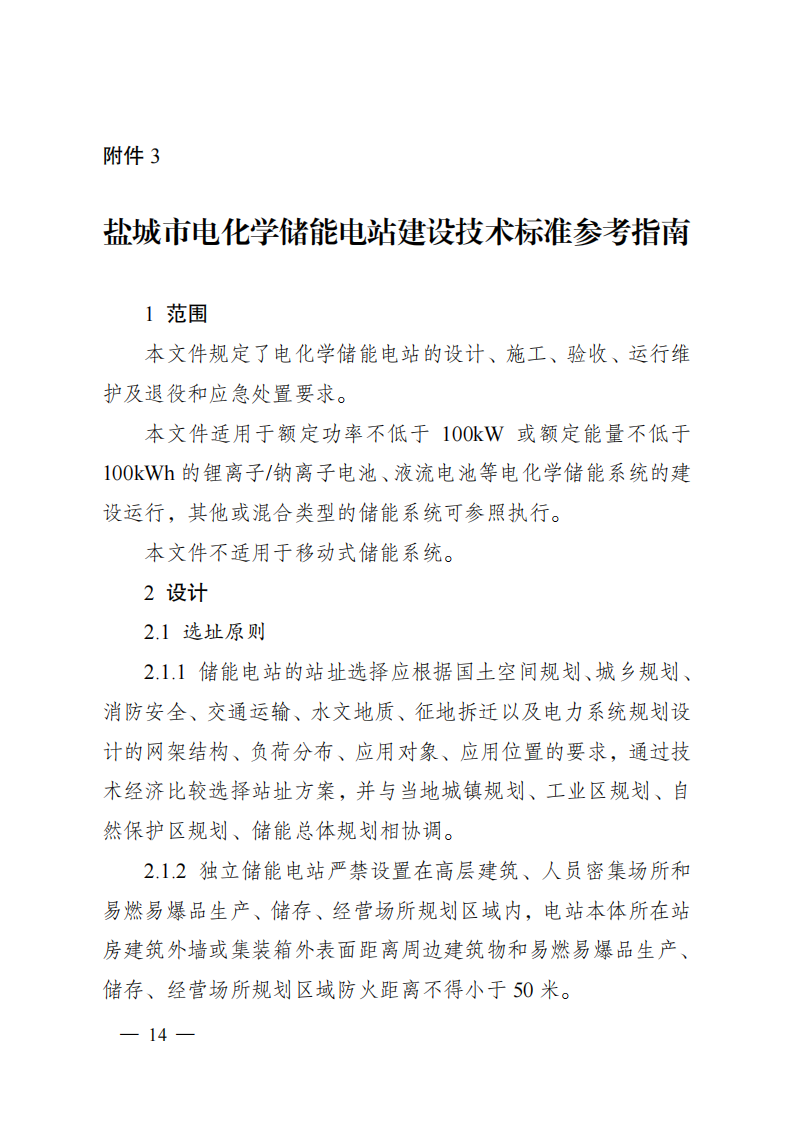 1月16日,江苏省盐城市人民政府发布关于加强新型储能电站建设管理工作的指导意见,其中提到,2025年,盐城独立共享新型储能项目并网装机规模不低于1.61GW,到2027年不低于1.81GW。意见提出,将制定独立共享新型储能电站建设年度计划,不包括用户侧、电源侧储能;支持海上风电开发企业在海上风电场并网接入点周边建设独立共享新型储能电站,开展“海上风电+储能”建设;开展“光伏+储能”建设;加快“新能源+储能+微电网”应用,努力构建以绿色电力供应为主的园区级新型电力系统。同时,《指导意见》还附录了相关部门及各地政府职责分工、新型储能电站项目建设流程示意图、电化学储能电站建设技术标准参考指南。意见提到,新型储能电站应当优选安全、可靠、环保的产品及系统,严控储能电站相关产品及系统质量。建立对储能电站安全相关的核心部件或单元到货抽检制度,抽检对象包括但不限于电池单元、电池模块、电池管理系统。意见提到,独立共享电化学储能电站严禁设置在高层建筑、人员密集场所和易燃易爆品生产、储存、经营场所规划区域内,电站本体所在站房建筑外墙或集装箱外表面距离周边建筑物和易燃易爆品生产、储存、经营场所规划区域防火距离不得小于50米。意见指出,独立共享新型储能项目有效全容量下连续放电时间不低于2小时,采用锂电池技术的在不更换主要设备的前提下完全放电次数不应低于6000次,充放电深度不低于90%,并选用技术成熟、安全性能高的模块化电池,不得选用梯次利用动力电池。