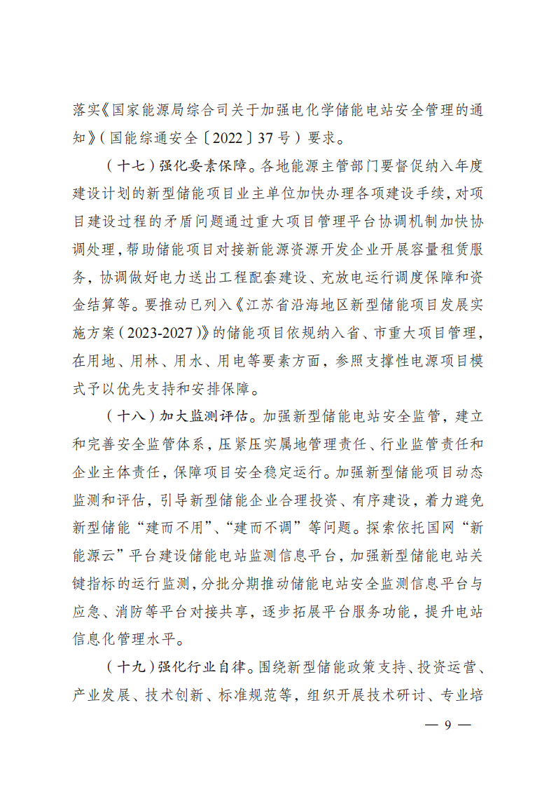 《关于加强新型储能电站建设管理工作的指导意见》政策解读一、出台背景。为促进新型储能电站科学布局、安全发展,加快构建适应大规模高比例新能源发展需求的新型电力系统,扎实推进能源绿色低碳转型,加快建设“绿色低碳发展示范区”,结合盐城实际,制定出台《关于加强新型储能电站建设管理工作的指导意见》(以下简称《指导意见》)。二、主要依据。《国家发展改革委国家能源局关于加快推动新型储能发展的指导意见》(发改能源规〔2021〕1051号)、《国家发展改革委国家能源局关于印发<“十四五”新型储能发展实施方案>的通知》(发改能源发〔2022〕209号)和《省发展改革委关于印发沿海地区新型储能项目发展实施方案(2023-2027)的通知》(苏发改能源发〔2023〕774号)等。三、主要目标。到2025年,盐城新型储能电站步入规模化发展阶段,全市独立共享新型储能项目并网装机规模不低于161万千瓦,其中,2024年6月底前并网装机规模不低于80万千瓦。新型储能技术路线实现多元化发展,电站技术标准、质量管理水平、建设运营监管等走在全省前列。到2027年,全市独立共享新型储能并网装机规模不低于181万千瓦。新型储能多重灵活调节功能更加凸显,与电力系统各环节深度融合,基本满足新能源发展和构建新型电力系统需求,新型储能成为能源领域碳达峰碳中和的关键支撑之一。四、主要内容。《指导意见》坚持了“规划引领、创新驱动、立足安全”原则,从“规划布局、项目准入、项目设计、施工验收、并网调度、运行维护、部门监管、应急处置”等环节,明确各阶段具体要求,通过提高储能电站相关产品及系统质量和健全科学规范的管理体系来提升新型储能电站项目安全性,防范安全隐患。《指导意见》主要分为六个部分。第一部分,总体要求,包含指导思想、基本原则、发展目标等方面。重点提出到2025年,全市新型储能并网装机规模不低于161万千瓦,至2027年不低于181万千瓦;第二部分,加强规划引导,鼓励储能多元发展。包含储能项目科学合理布局、储能电站不同场景应用、储能技术多元融合发展等方面。重点提出独立共享电化学储能电站防火距离不得小于50米;第三部分,完善报批流程,规范项目源头管理。包含纳规流程、项目备案、规范建设等方面。重点提出可研报告评审和项目设计由规定资质的单位承担;额定功率5万千瓦及以上的项目由省能源局评估纳规,5万千瓦以下的由市发改委评估纳规;第四部分,严格技术标准,切实提高本质安全。包含设计管理、产品质量、建设标准等方面。重点提出建立储能产品到货抽检制度;独立共享新型储能项目连续放电时间不低于2小时;不得选用梯次利用动力电池;第五部分,强化运行监管,切实提升安全水平。包含项目运行监督、安全生产管理、生态环境保护等方面。重点提出项目投运前三年每年至少进行一次涉网性检测,三年后每年进行一次整站检测;建立应急联动机制,每半年至少开展1次火灾应急演练;第六部分,加强协调保障,营造良好市场环境。包含组织领导、要素保障、监测评估、行业自律等方面。重点提出加强项目动态监测和评估;引导企业合理投资、有序建设,着力避免新型储能“建而不用”、“建而不调”等问题。《指导意见》还附录了相关部门及各地政府职责分工、新型储能电站项目建设流程示意图、电化学储能电站建设技术标准参考指南。免责声明:文章转载自北极星储能网,仅作转载分享非商业用途,如有侵权请联系作者删除,谢谢!